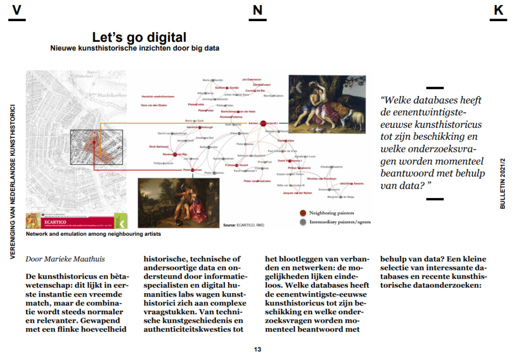 Left: Research featured in Anne van den Dool, ‘17de-eeuws kunstnetwerk in kaart’, Bulletin van de Vereniging Rembrandt 2021 (3), pp. 50-51. Right: Research featured in Marieke Maathuis, ‘Let’s go digital: Nieuwe kunsthistorische inzichten door big data’, Bulletin Kunsthistorici: Tech-Savvy 2021 (2), pp. 13-14.